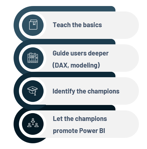 Power BI skills are like any other skill: you don't use it, you lose it. This applies especially to the first two weeks after the training. Therefore, teaching your end users basics of Power BI before you roll out the first reports is a lost investment. When you finally release those reports, they will need to participate in another training, as they will forget everything by then.