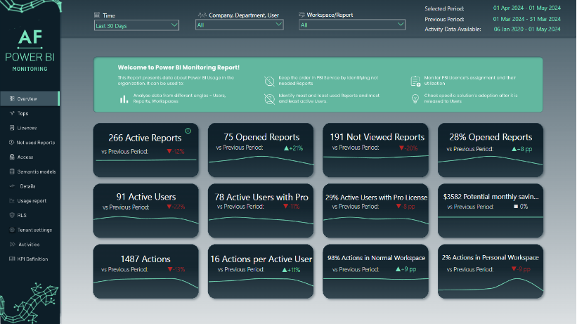Power BI Report is the primary tool that helps you gain a better understanding of what’s happening within your Power BI Tenant. Power BI Monitoring provides deep insights and control over your Power BI environment. It allows you to manage and optimize your Power BI usage, improve governance, and enhance overall efficiency. Let’s take a look at some features of Power BI Monitoring: